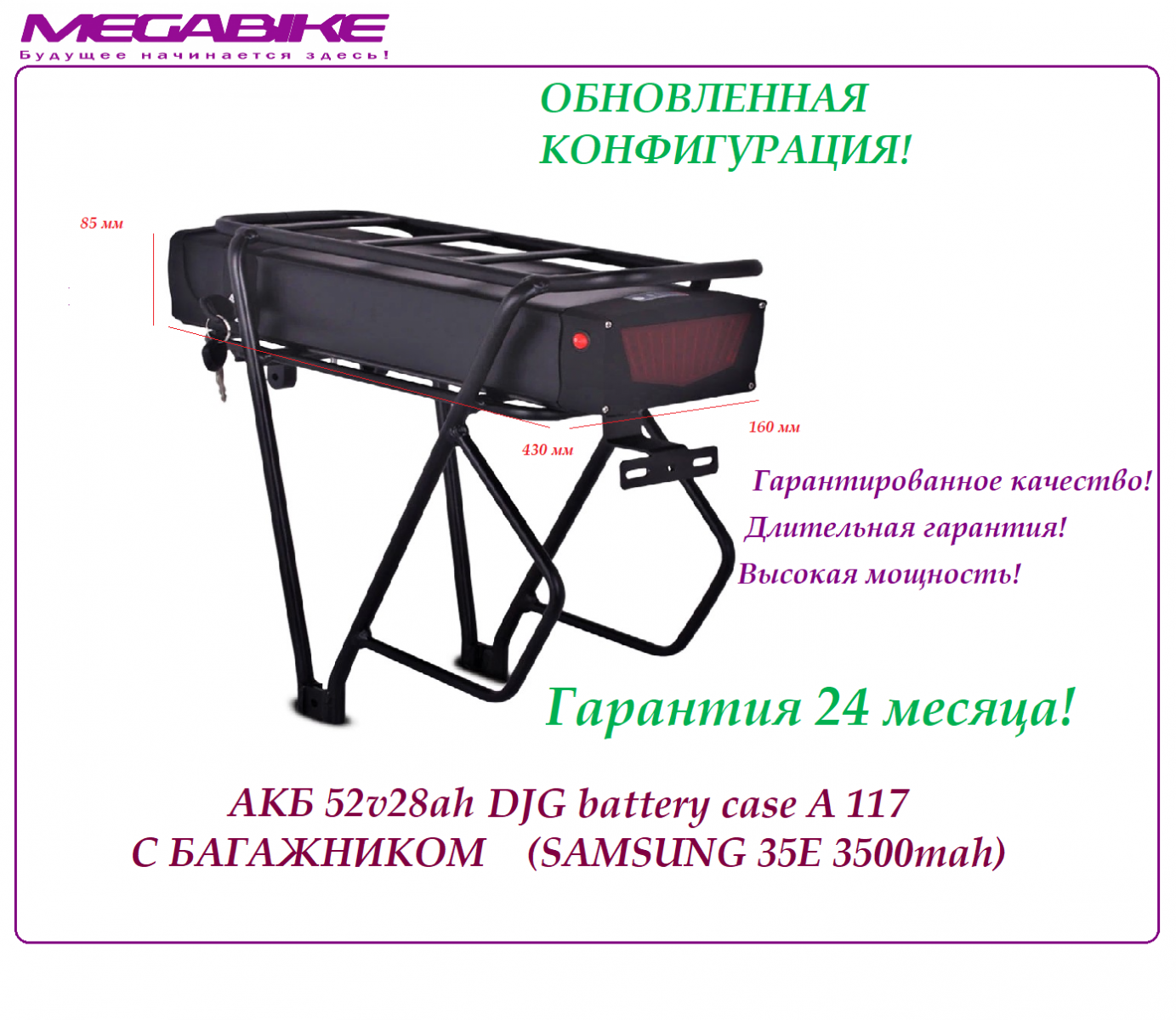 Аккумуляторная батарея на электро-велосипед АКБ 52v28ah DJG battery case A 117 с багажником (SAMSUNG 35E 3500mah) в быстросъемном боксе DJG battery case A 117 с багажником.