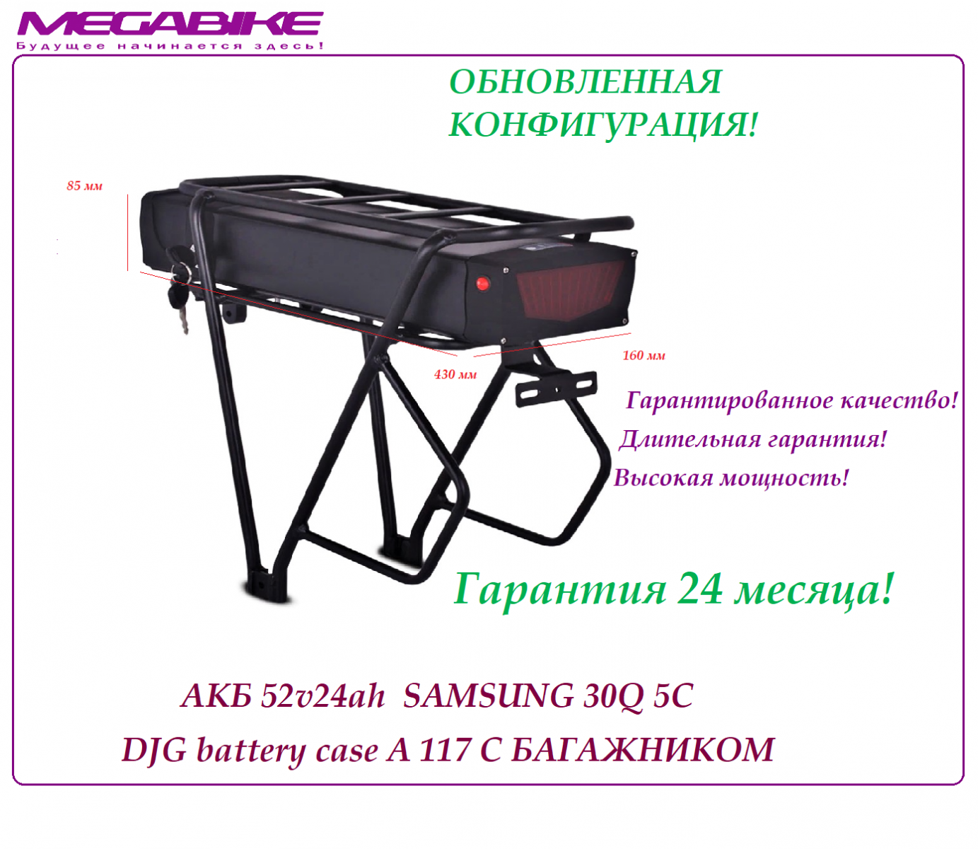 Аккумуляторная батарея на электро-велосипед АКБ 52v24ah (SAMSUNG 30Q 3000 mah 5С) DJG battery case A 117 с багажником в быстросъемном боксе DJG battery case A 117