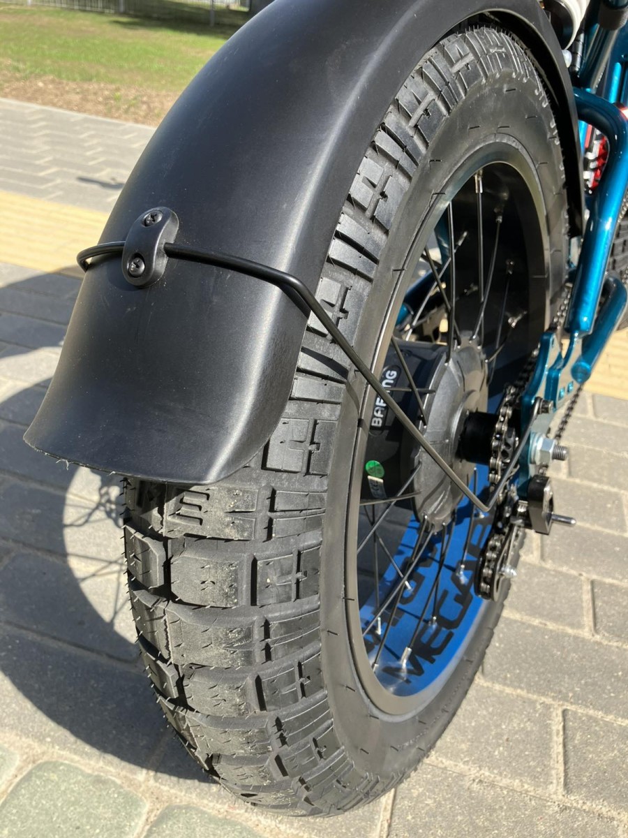 Комфортное и уверенное передвижение обеспечивают обода 100мм усиленные двойные. Фирменные покрышки Super 73 20*5.0 МЕ имеют развитый, но не агрессивный протектор. Этот протектор обеспечивает тихое передвижение по асфальту и в то же время хороший зацеп на сложных грунтах.